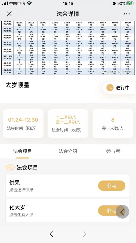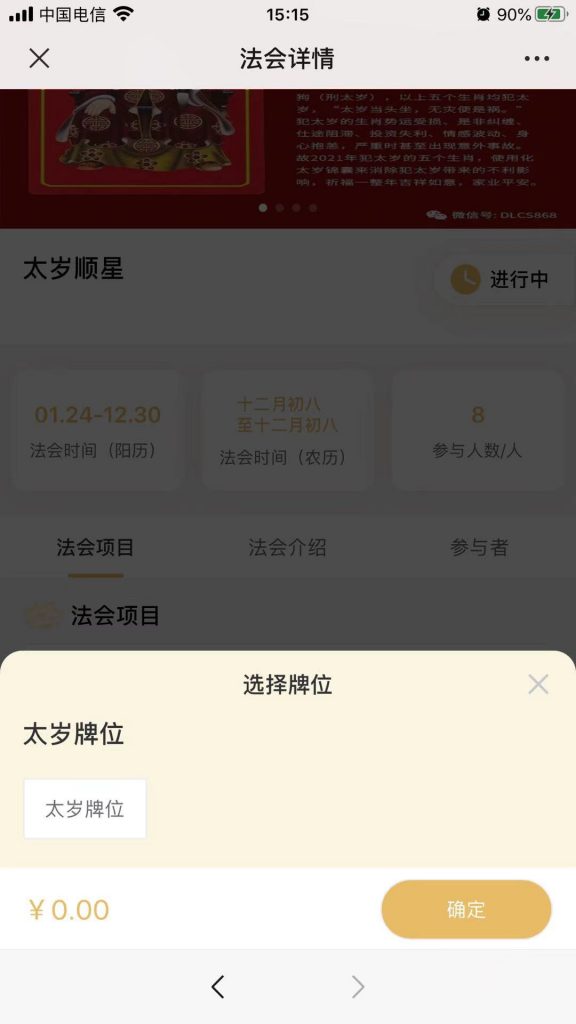 4、法會板塊隨喜功能文案頂部配置,可自定義隨喜法會項目選項(放生修福、供燈祈福,牌位供奉或化太歲等隨喜法會項目按鍵),信眾指尖促達隨喜供奉。